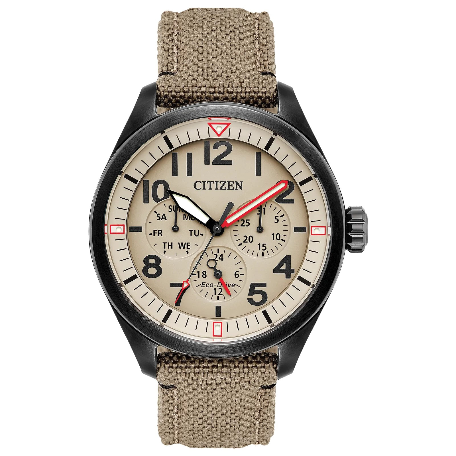 For a rugged look with a comfortable fit, this Citizen military inspired timepiece fits the bill. The Citizen Chandler is featured here in black ion-plated stainless steel case, tan Cordura® strap and sand colored dial. Added features include analog day/date and12/24-hour time. Featuring our Eco-Drive technology – powered by light, any light. Never needs a battery. Caliber number 8729.