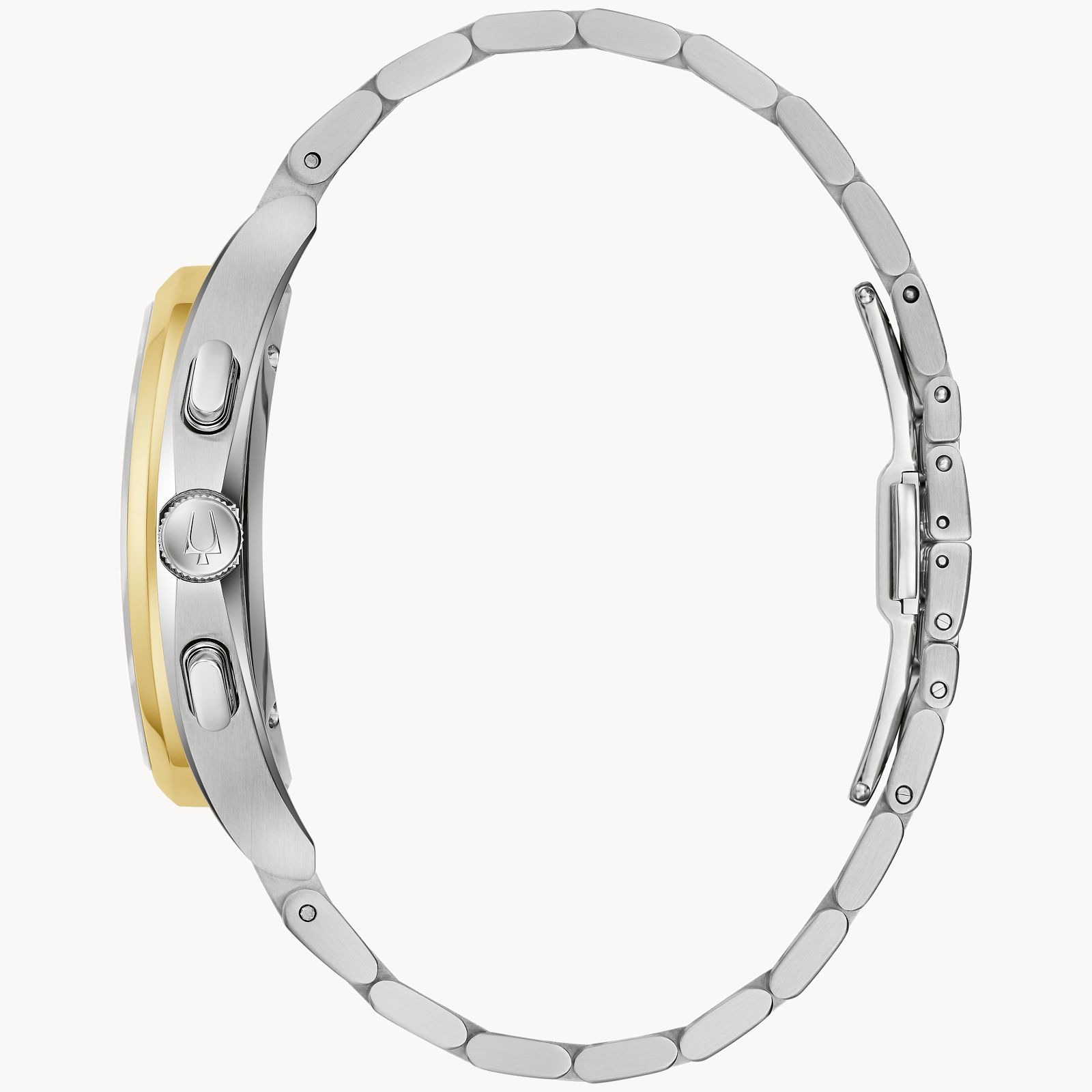 This new Bulova men’s five-hand chronograph timepiece pushes the groundbreaking CURV collection in a new direction that affords unrivaled sophistication together with Bulova’s cutting-edge technology. CURV timepieces are equipped with the world’s first curved chronograph movement, with high-precision 262khz quartz technology offering exceptional accuracy of 5 seconds per month. This new CURV model features a dynamic gold- and silver-tone stainless steel case with brushed and polished finishes and a curved sapphire crystal. The refined black dial features striped patterning, with a translucent ring offer a glimpse at the intricate movement beneath. Gold-tone stainless steel markers and hands offer contrast against the dial, while three sub-dials display the elapsed chronograph time in 12-hour, 60-minute, and 60-second intervals. The chronograph 60-second sub dial at 6 o’clock doubles as the standard seconds hand. The dual mode is implemented by the 4 o’clock pusher. The watch is paired with a matching tapering silver and gold-tone stainless steel bracelet with a deployant clasp with pushers. Reinterpreting the elegant lines of the original CURV, this new Bulova timepiece presents a sleek and refined dress aesthetic perfect for any occasion.