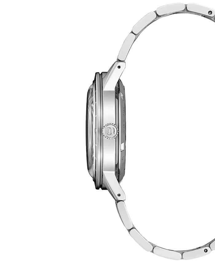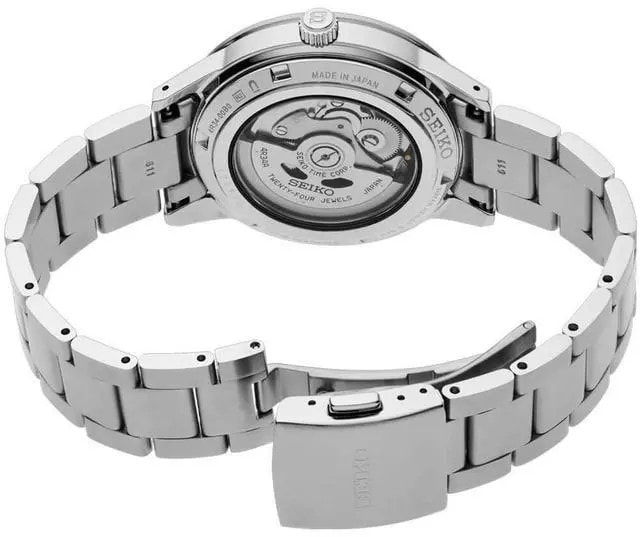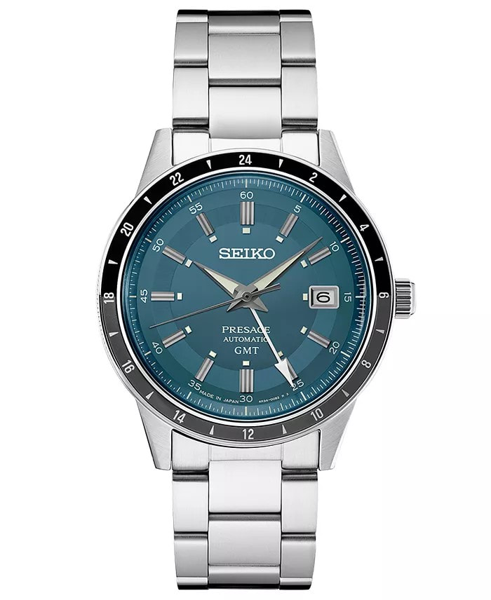 Presage Style60's GMT. Offering the finest in Japanese mechanical watchmaking, the Presage Collection blends precision technology with superior craftsmanship and design. Inspired by the steering wheel, levers, instruments and metallic colors of vintage 1960s touring cars, the Style60's GMTGMT models create a distinctive retro feel with broad angular lines, box-shaped crystals, faceted indices and sharp hand design. Celebrating the spirit of the decade, the collection incorporates dial elements from Seiko’s 1964 “Crown Chronograph,” Japan’s first watch with a stopwatch function. Framed by a black and dark gray 24-hour GMT bezel, the warm blue-gray dial features a date calendar and GMT hand, as well as LumiBrite hands and markers. The screwdown see-through caseback provides a view of the 24-jewel movement with manual winding capability, a frequency of 21,600 vibrations per hour and a power reserve of approximately 41 hours. Crafted of stainless steel, in a new hairline finish suggesting the metallic, machine-like feel of ’60s cars, this memorable timepiece includes a tri-fold push button release clasp. 10 bar, 100M Water Resistant